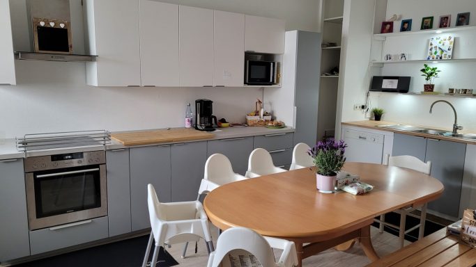 Die Küche bietet genug Raum, um das gemeinsame Frühstück und Mittagessen mit den Kindern zusammen einzunehmen oder auch zuzubereiten.